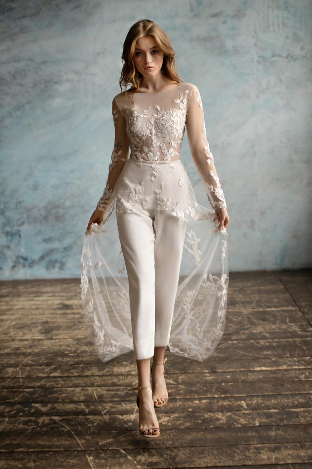 Looking for something really fresh? A “wedding dress” jumpsuit screams cool, modern and fashion-forward. In fact, more and more brides of London are asking about comfortable and relaxed designs that can be an alternative to wedding dresses. Our Ivy jumpsuit is a true vision with an ethereal sheer bodice decked with romantic embroidery and crisp cropped trousers. To zhuzh it up even more, we added a detachable train that ups the glam factor.